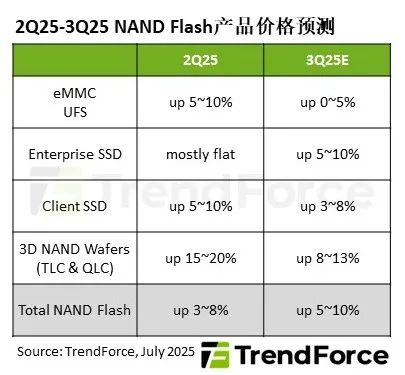 随着原厂转移产能至高毛利产品,市场流通供给量缩减。需求面则有企业加码AI投资,以及NVIDIA(英伟达)新一代Blackwell芯片大量出货支撑。展望第三季NAND Flash价格走势,预估平均合约价将季增5%至10%,但eMMC、UFS产品因智能手机下半年展望不明,涨幅较低。